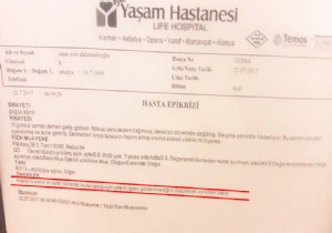 Hasta gittikten sonra tutulan raporda, (kırmızı çizgili ile belirtilen) damar yolunun iki kez denenip açılamadığı yazılmış.