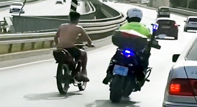 Alanya İlçe Emniyet Müdürlüğü'ne bağlı motorize trafik ekipleri, 26 Nisan'da gerçekleştirdikleri denetimlerde kasksız sürücü A.Ş. idaresindeki plakasız motosikleti durdurmak istedi. Polisin 'Dur' ihtarına uymayan sürücü A.Ş., ters yöne girerek Mevlüt Çavuşoğlu Bulvarı'ndan kaçmaya başladı. Kaskı ve koruyucu kıyafeti bulunmayan, vücudunun üst kısmı çıplak şekilde trafik güvenliğini tehlikeye sokarak ilerlemeye çalışan A.Ş. ile ekipler arasında takip başladı. Yeni çevre yolunda devam eden takip sırasında motosiklet sürücüsü A.Ş., dengesini kaybederek düştü. Yaya olarak kaçmaya çalışan A.Ş. kısa sürede yakalandı. A.Ş.'ye 'Ehliyetsiz araç kullanmak', 'Tescil plakasız araç kullanmak', 'Ters yönden araç kullanmak', 'Tehlikeli şekilde birden fazla kez şerit değiştirme', 'Kask takmamak' ve 'Dur ikazına uymamak' suçlarından toplam 38 bin 968 lira ceza uygulandı.