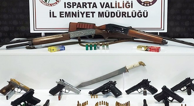 Isparta Cumhuriyet Başsavcılığı koordinesinde yapılan operasyonda 'silah ve mühimmat kaçakçılığı' suçu kapsamında Isparta ve Afyonkarahisar illerinde bulunduğu belirlenen 8 şüpheli eş zamanlı operasyon sonucun yakalanarak gözaltına alındı. Operasyonlarda yapılan aramalarda 2 ruhsatsız av tüfeği, 6 av tüfeği fişeği, 7 tabanca ve 104 fişek, 10 tabanca şarjörü, 'pala' tabir edilen kılıç ele geçirildi.