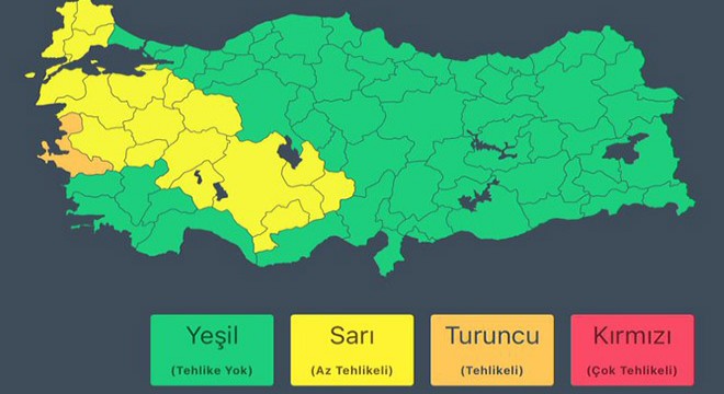 İçişleri Bakanlığı, MGM'den alınan bilgilere göre, bugün beklenen gök gürültülü sağanak ve fırtına nedeniyle İzmir için ‘turuncu’, 18 il için ‘sarı’ kodlu uyarı verildiğini bildirdi. Bakanlığın sosyal medya hesabından yapılan açıklamada, "Bursa ve Yalova çevrelerinde sağanak ve gök gürültülü sağanak yağışların yerel kuvvetli olması beklenmektedir. Balıkesir'in kuzey ve batısı ile Çanakkale'nin iç kesimlerinde yerel olarak kuvvetli sağanak ve gök gürültülü sağanak yağış beklenmektedir. Edirne, Tekirdağ ve Kırklareli çevrelerinde yerel kuvvetli sağanak ve gök gürültülü sağanak yağış beklenmektedir. İç Ege (Denizli hariç), Marmara'nın güneyi (Balıkesir'in güneydoğusu, Bursa ve Bilecik'in güneyi) ve İç Anadolu'nun güneyi (Konya, Karaman, Niğde ve Aksaray) ile Eskişehir ve Isparta çevrelerinde güney yönlerden kuvvetli rüzgar ve fırtına (40-60 km/saat, yükseklerinde 80 km/saat) bekleniyor. Vatandaşlarımızın sel, su baskını, yıldırım, dolu yağışı, yağış anında kuvvetli rüzgar, ulaşımda aksamalar, çatı uçması ve ağaç devrilmesi gibi olumsuzluklara karşı dikkatli ve tedbirli olmasını; yetkili mercilerin uyarılarını dikkate almalarını önemle hatırlatıyoruz" denildi.