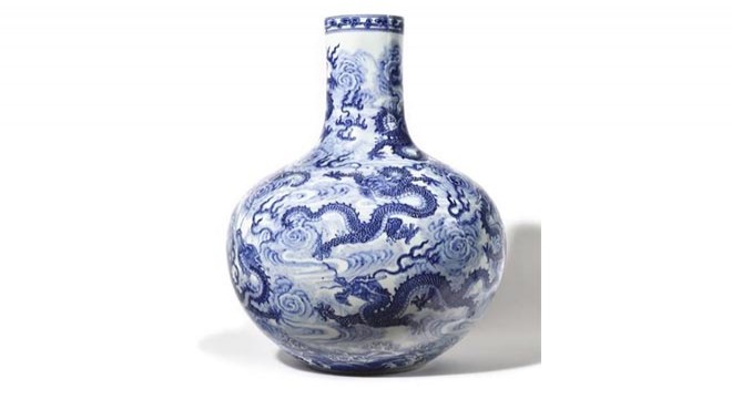 Mavi-beyaz renkte, üzerine dokuz vahşi ejderha ve bulutlar tasvir edilmiş Çin kültürüne ait Tianqiu-ping tarzı vazonun müzayede evi tarafından bir uzmana gösterildiği ve uzmanın ise vazonun 20. Yüzyıldan kalma olduğunu belirterek 1.500 ila 2 bin Euro arasında bir fiyat biçtiği ifade edildi. Müzayede evi ise alıcıların vazonun 18. yüzyıldan kalma olduğuna inandıklarını belirtti. Müzayede evi açıklamasında, vazoyu satış için kataloglarına alınca Çinli alıcılar tarafından büyük ilgi gördüğünü ve bazı Çinli alıcıların bizzat vazoyu görmeye geldiğini kaydetti. Vazo, telefonla bağlanan ve ismi açıklamayan bir Çinli tarafından alındı.