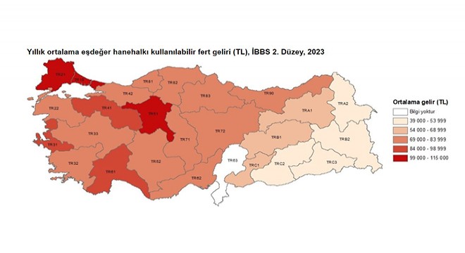Türkiye'de yaşanan deprem nedeni ile 2023 yılında TR63 (Hatay, Kahramanmaraş, Osmaniye) bölgesinde alan çalışması yapılamadığı için İstatistiki Bölge Birimleri Sınıflandırması (İBBS) ayrımında verilen bölgesel sonuçlar 25 bölgeyi kapsadı. Araştırma sonuçlarına göre, Türkiye'de yıllık ortalama eşdeğer hanehalkı kullanılabilir fert geliri 2023 yılında 83 bin 808 TL iken, İBBS 2'nci Düzey bölgeleri itibarıyla en yüksek olduğu bölge 114 bin 634 TL ile TR10 (İstanbul) bölgesi oldu. Bu bölgeyi, 108 bin 36 TL ile TR51 (Ankara) bölgesi ve 101 bin 372 TL ile TR21 (Tekirdağ, Edirne, Kırklareli) bölgesi izledi. En düşük yıllık ortalama eşdeğer hanehalkı kullanılabilir fert geliri ise 39 bin 173 TL ile TRB2 (Van, Muş, Bitlis, Hakkari) bölgesinde gerçekleşti.