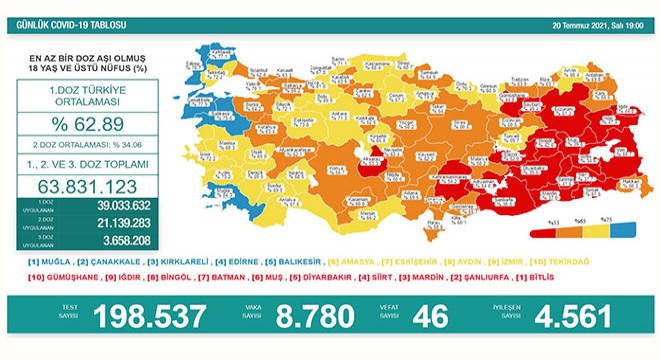 En az bir doz aşı olmuş 18 yaş ve üzeri nüfus verilerinde 1'inci doz Türkiye ortalaması yüzde 62,89, 2'nci doz ortalaması yüzde 34,06 olarak ölçüldü. Ayrıca, 1'inci dozda 39 milyon 33 bin 632, 2'nci dozda 21 milyon 139 bin 283 ve 3'üncü dozda 3 milyon 658 bin 208 olmak üzere toplam 63 milyon 831 bin 123 aşı uygulandı.