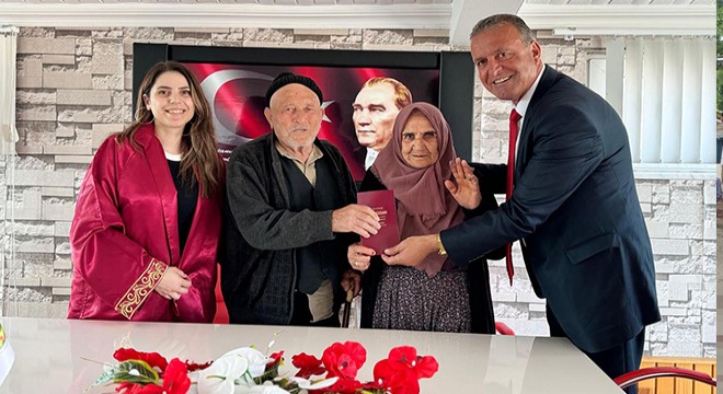 Altunhisar'a bağlı Yakacık köyünde dini nikahla yaşayan Elmas Sağlam ile Ahmet Erol, birlikteliklerinin 60'ncı yılında resmi nikah kıydırmaya karar verdi. Belediyeye başvuran 8 çocuk, 20 torun sahibi çiftin nikahını Altunhisar Belediye Başkanı Neşet Doygun kıydı. Çifte mutluluklar dileyen Doygun, "Çiftin resmi nikahlarını bizzat kıydık. Evlilik yaşamlarında örnek olan çiftin mutlulukları gözlerinden okundu" dedi. (DHA)