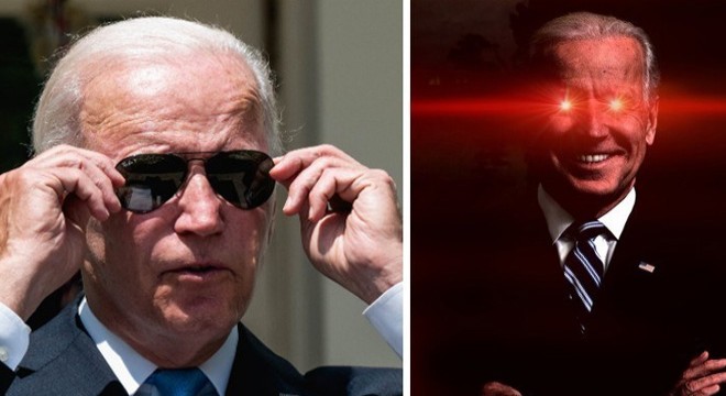 The Sun gazetesinde yer alan habere göre, "Super Bowl"un hileli olduğuna dair ortaya atılan komplo teorisi ile dalga geçen Biden, gözlerinden kırmızı lazer çıkan görselini sosyal medya platformu X'te paylaştı.