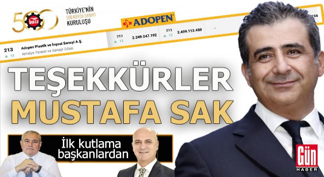 Mustafa Sak’ın sahibi olduğu ADOPEN Plastik ve İnşaat Sanayi A.Ş, her yıl olduğu gibi bu yıl da listede yerini aldı. ADOPEN, üretimden satışlarda 13 sıra, net satışlarda ise 12 sıra birden yükselerek 500 büyük sanayi kuruluşu arasında 213’ncü olmayı başardı. ADOPEN, aktif toplamda ise 147’nci sıraya oturdu.