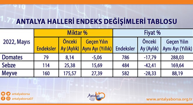 Mayıs ayı endeksleri miktarda bir önceki aya göre (aylık) domateste yüzde 8.14, sebzede yüzde 25.38, meyvede ise yüzde 175.57 arttı. Miktar endeksleri geçen yılın aynı ayına göre (yıllık) domateste yüzde 5.06 azalırken, sebzede yüzde 15.69 ve meyvede ise yüzde 27.39 artış kaydetti. Mayıs ayında miktar ve fiyat endekslerindeki yıllık değişimler, domateste, sebzede ve meyvede fiyat bakımından son 7 yılın rekorunu kırarken, miktar bakımından ortalamada seyretti.