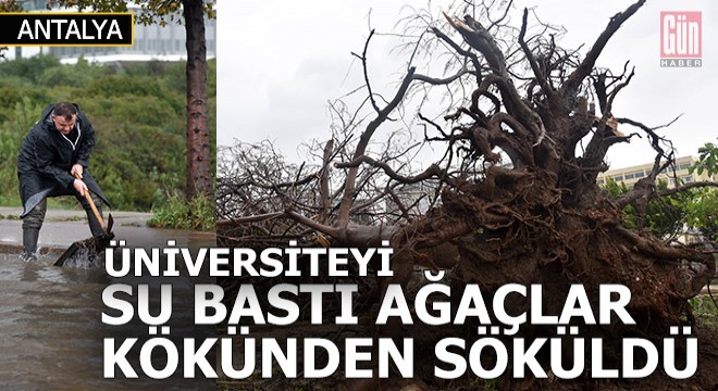Aşırı yağış nedeniyle Akdeniz Üniversitesi yerleşkesi içinde suda kalan bir otomobil, güvenlik görevlilerinin yardımıyla servise çekildi. Üniversite kütüphanesi önünde yer alan ve çeyrek asırlık olduğu belirtilen ağaç yerinden sökülerek, devrildi.
