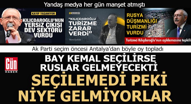 Cumhurbaşkanlığı ve milletvekilliği seçiminin yapıldığı Mayıs ayında Rus pazarının zayıf geçmesini Millet İttifakı’nın adayı Kemal Kılıçdaroğlu’nun attığı tweetlere bağlayan Ak Parti, Antalya’da bunu seçim malzemesi haline getirmişti. Yandaş medya da bu tweet üzerinden günlerce, "Bay Kemal'e oy verirseniz, Rus turist gelmez" manşetleri atmıştı.