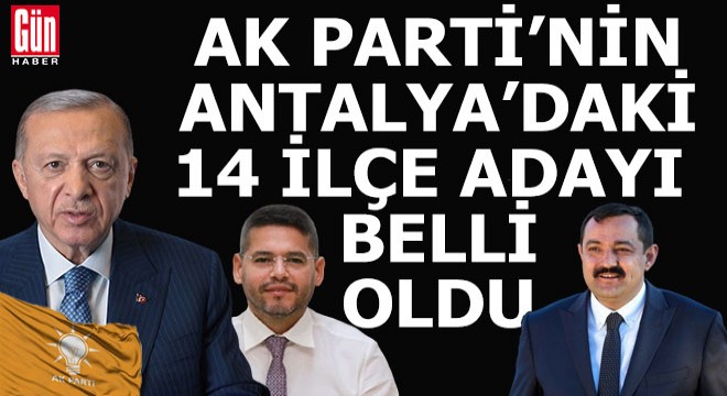 Antalya Büyükşehir Belediye Başkan Adayı- Hakan Tütüncü (AK PARTİ), Akseki Belediye Başkan Adayı İbrahim Özkan (AK PARTİ), Aksu Belediye Başkan Adayı Durmuş Kaan Şahin (AK PARTİ), Alanya Belediye Başkan Adayı Adem Murat Yücel (MHP), Demre Belediye Başkan Adayı İbrahim Oğuz (MHP), Döşemealtı Belediye Başkan Adayı Bekir Kıvrım (AK PARTİ), Elmalı Belediye Başkan Adayı Durmuş Ali Gökçe (AK PARTİ), Finike Belediye Başkan Adayı Cenk Şimşek (MHP), Gazipaşa Belediye Başkan Adayı Mustafa Aksoy (MHP), Gündoğmuş Belediye Başkan Adayı Ali Gülen (AK PARTİ), İbradı Belediye Başkan Adayı Hatice Sekmen (AK PARTİ), Kaş Belediye Başkan Adayı Mutlu Ulutaş (AK PARTİ), Kemer Belediye Başkan Adayı Rahman Şeker (AK PARTİ), Kepez Belediye Başkan Adayı Rıza Sümer (AK PARTİ), Konyaaltı Belediye Başkan Adayı Durali Kolpak (AK PARTİ), Korkuteli Belediye Başkan Adayı Sadık Önal (MHP), Kumluca Belediye Başkan Adayı Hüseyin Orhantekin (AK PARTİ), Serik Belediye Başkan Adayı Veli Vural (AK PARTİ), Manavgat Belediye Başkan Adayı Süleyman Okudan (AK PARTİ), Muratpaşa Belediye Başkan Adayı Özdemir Manavoğlu (AK PARTİ).