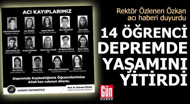 Kahramanmaraş'ta 7.7 ve 7.6 büyüklüğündeki 10 ili etkileyen depremler nedeniyle şu ana kadar 31 binden fazla kişi hayatını kaybetti, yaralı sayısı da 90 bine ulaştı. Akdeniz Üniversitesi Rektörü Prof. Dr. Özlenen Özkan, 14 öğrencisinin deprem bölgesinde hayatını kaybettiğini açıkladı. Sosyal medya hesaplarından, öğrencilerinin siyah beyaz fotoğraflarından oluşan paylaşım yapan Prof. Dr. Özkan, "Depremde kaybettiğimiz öğrencilerimize Allah'tan rahmet dileriz" dedi.