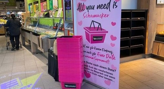 Almanya’nın Karlsruhe şehrindeki bir Edeka şubesinde başlayan uygulamada, yeni flört arayan kişiler pembe renkli alışveriş sepeti kullanarak bekar olduklarını ve yeni tanışmalara açık olduklarını gösteriyor.