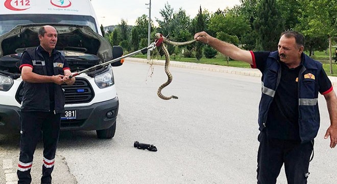 Olay, dün kent merkezi üniversite hastanesi önünde meydana geldi. 112 ekipleri Sandıklı ilçesine bağlı Akharım beldesinde baraj yolunda düşerek ayağını kıran bir hastanın olay yerinden alınıp hastaneye nakli görevine gitti. Daha sonra hastayı 03 BS 381 plakalı ambulans ile alan sağlık görevlileri kent merkezindeki üniversite hastanesine getirdi. Hastanın sedyeyle konulmasının ardından ambulansın motor kısmından sesler geldiğini fark eden şoför Hasan Hüseyin Yılmaz aracın altına eğilip baktığında yılanı fark etti. Şoförün haber vermesi üzerine olay yerine itfaiyeyi sevk edildi.
