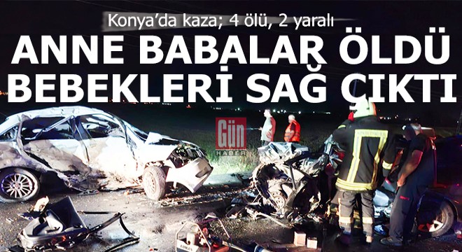 Kaza, saat 03.30 sıralarında Gaziosmanpaşa Mahallesi Ereğli Caddesi’nde meydana geldi. Yusuf Yılmaz’ın (30) kontrolünü yitirdiği 34 HR 0351 plakalı otomobil, karşı şeride geçerek Hüseyin Kart (30) idaresindeki 01 BJC 05 plakalı otomobile çarptı. Her iki aracın da hurdaya döndüğü kazada Yusuf Yılmaz ve eşi Zeynep Yılmaz (27) ile diğer otomobilin sürücüsü Hüseyin Kart (30) ve eşi Şeyma Kart (29) hayatını kaybetti. Yılmaz çiftinin 6 aylık bebeği Meryem Hira Yılmaz ile Kart çiftinin kızı Nisan Kart (2) ise ağır yaralandı. İki bebek, hastanelere kaldırılıp tedaviye alındı. Kazada ölen 4 kişinin cansız bedenleri, otopsi için Karapınar Devlet Hastanesi'nin morguna götürüldü.
