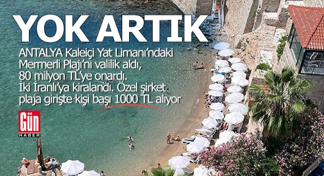 Antalya Kaleiçi Yat Limanı'nda bulunan ünlü Mermerli Plajı'nı devralan Antalya Valiliği, 80 milyondan fazla para harcayarak çevre düzenlemesi ve restorasyon projesi yaptı. Arkeolojik ve kentsel sit olan bölgede uygulanan projeyi Koruma Bölge Kurulu onaylamazken, Mermerli Plajı'nın 30 Mayıs'ta özel bir işletmeye devredildiği ortaya çıktı.