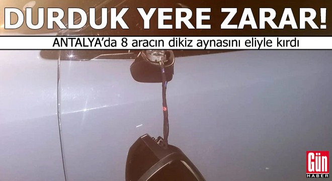 Olay, gece saat 03.30 sıralarında Konyaaltı ilçesi Altınkum Mahallesi Atatürk Bulvarı üzerinde meydana geldi. Bulvar üzerinde yer alan 8 aracın dikiz aynasının el vurmasıyla kırıldığının ihbarı üzerine bölgeye giden Konyaaltı İlçe Emniyet Müdürlüğü Devriye Ekipler Amirliği'ne bağlı polisler, yaptıkları inceleme ve kamera çalışmalarında olayı gerçekleştiren kişinin Bayram Berkay A. olduğunu tespit etti.