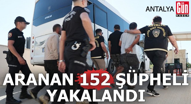 Antalya İl Emniyet Müdürlüğü ekipleri, kentin güvenliğini ve huzurunu sağlamak için hakkında yakalama emri bulunan, asayiş ve diğer suçlardan aranan şüphelilerin yakalanmasına yönelik eş zamanlı operasyon düzenledi. Antalya Cumhuriyet Başsavcılığı koordinesinde gerçekleşen operasyonda, aralarında 'hırsızlık, dolandırıcılık, yağma, çocuğun cinsel istismarı, kasten yaralama, tehdit, görevi yaptırmamak için direnme, hakaret, mala zarar verme, taksirle yaralama ve ölüme neden olma, resmi belgede sahtecilik, uyuşturucu madde ticareti ve 6136 Sayılı Kanuna Muhalefet' gibi çeşitli suçlardan aranması olan 152 şüpheli gözaltına alındı.