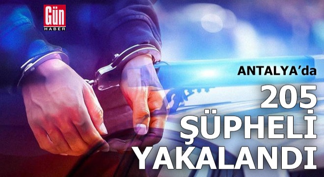 Antalya İl Jandarma Komutanlığı'nca suçların azaltılması, önlenmesi ve suçluların yakalanmasına yönelik jandarma dedektifleri Jandarma Suç Araştırma Timlerinin (JASAT) yaptığı çalışmalar neticesinde, farklı suçlardan aranan 10 yıl ve üzeri hapis cezası bulunan 7 şüpheli, 5- 10 yıl arası hapis cezası bulunan 9 şüpheli, 0- 5 yıl hapis cezası bulunan 39 şüpheli başta olmak üzere, toplam 205 şüpheli yakalanarak adli makamlara teslim edildi.