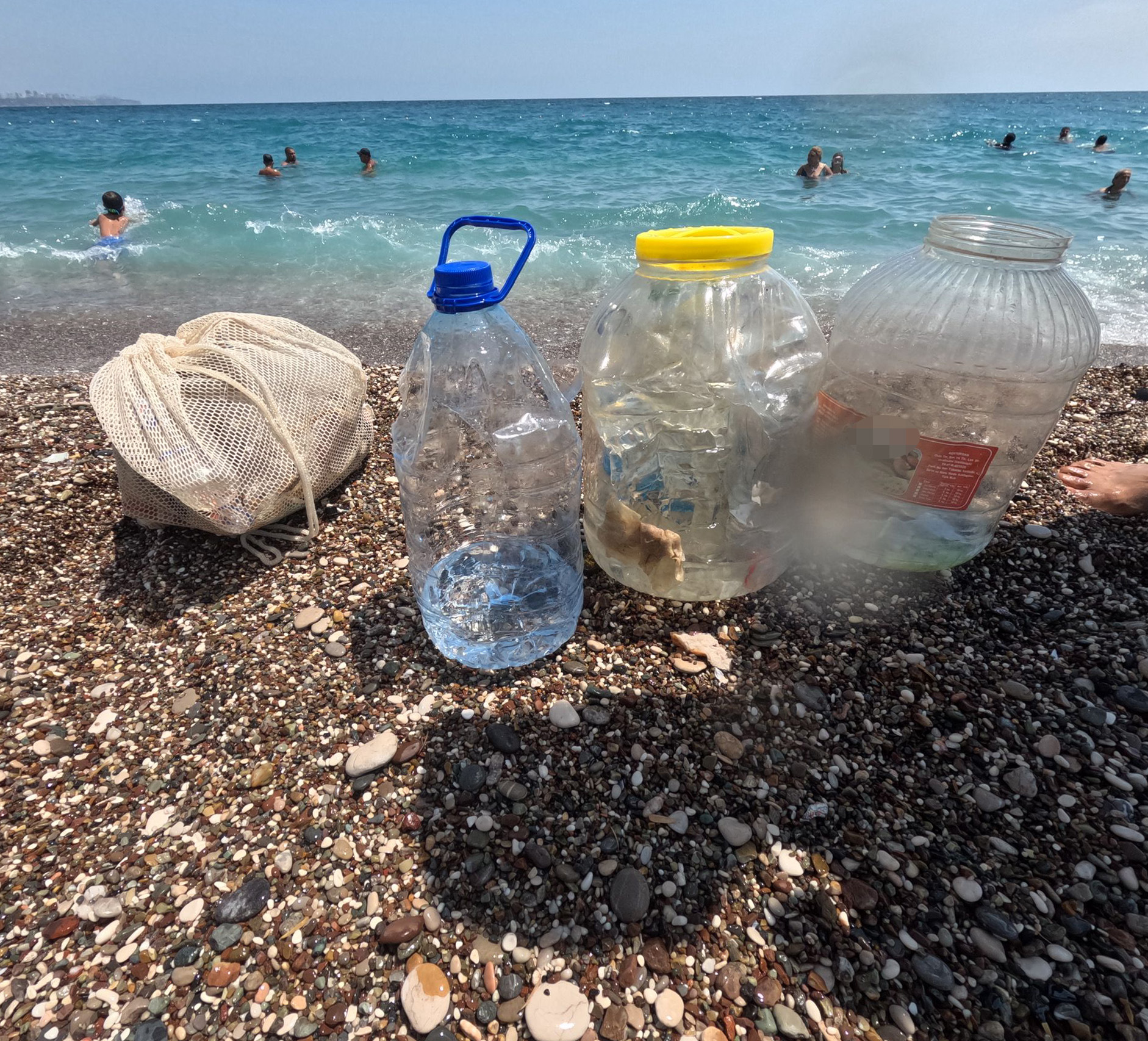 Prof. Dr. Gökoğlu, amatör balıkçıların sıklıkla pet şişe yöntemiyle balık tuttuğunu ve bu şişelerin deniz dibini kirlettiğini belirterek, “İnsanlar pet şişeyi kesip içine çakıl ve ekmek kırıntısı koyarak balık tutmaya çalışıyor. İşleri bittiğinde bu pet şişeleri denizin kenarında bırakıyorlar. Şişeler zamanla suyun dibine sürüklenip plastik atık haline geliyor. 20 litrelik, 5 litrelik, 1,5 litrelik pek çok farklı boyutta pet şişe buluyoruz. Bu yöntem denize ciddi zarar veriyor" diye konuştu.