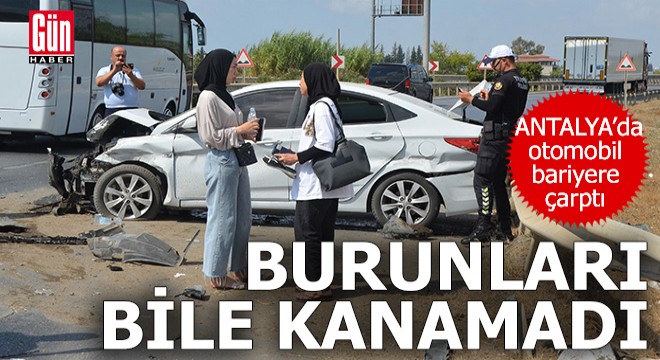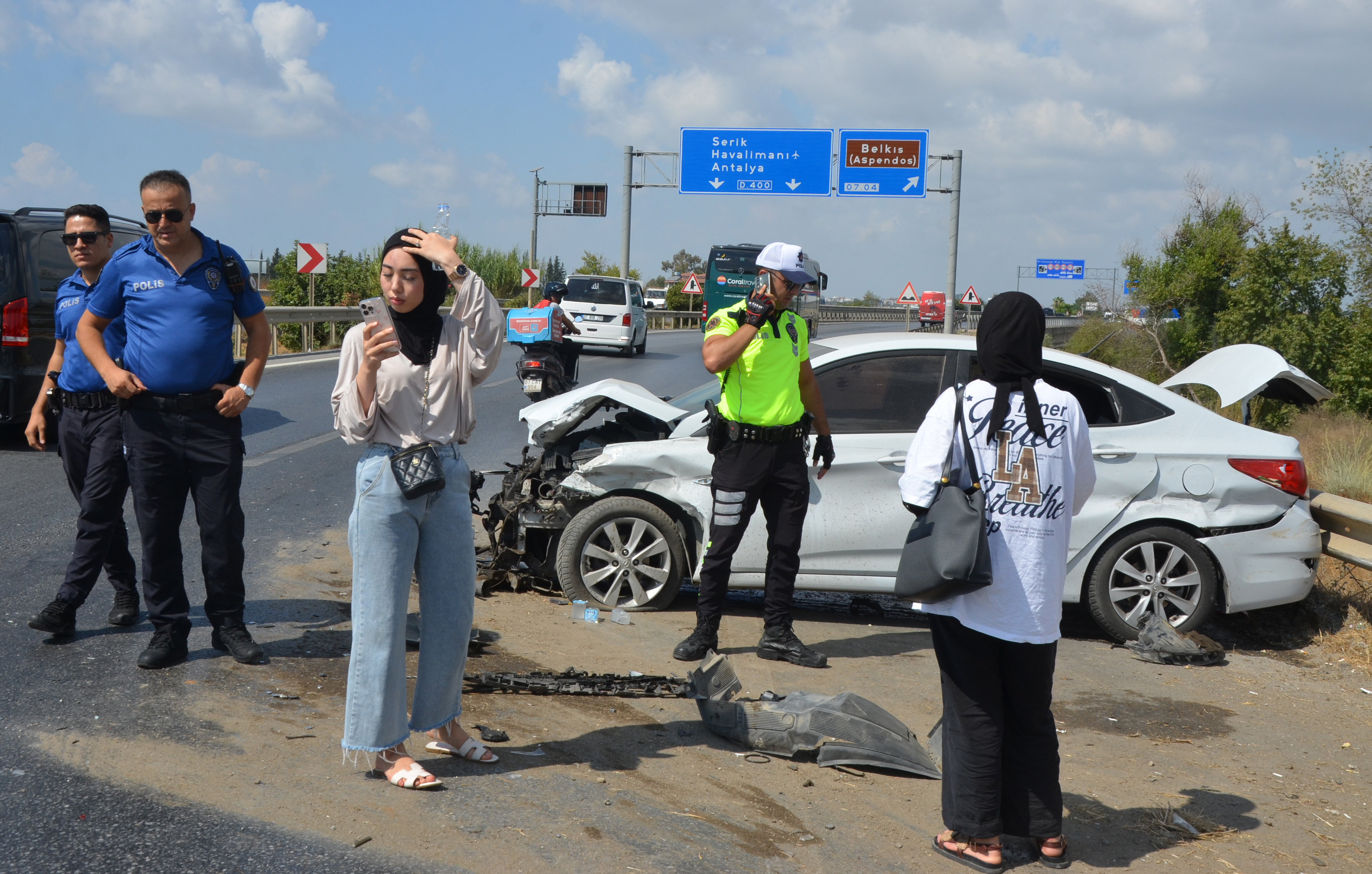 Kaza, saat 11.00 sıralarında Manavgat- Serik D400 yolu Aspendos Köprüsü yakınında meydana geldi. Henüz ismi öğrenilemeyen Kazakistan uyruklu kadın sürücü, kullandığı 34 BJL 019 plakalı otomobilin hakimiyetini kaybetti. Yol kenarında demir bariyere çarpan otomobildeki Kazakistan uyruklu sürücü ve beraberindeki kadın yolcu yara almadan kurtuldu. İhbar üzerine kaza yerine sağlık, itfaiye ve polis sevk edildi. Sağlık ekibi, sürücü ile beraberindeki yolcunun kontrolünü yaptı. Polis kazayla ilgili inceleme başlattı.