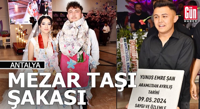 Döşemealtı ilçesindeki bir düğün salonunda evlenen Figen ve Yunus Emre Şan çiftinin düğününde ilginç anlar yaşandı. Damadın arkadaşları, çift fotoğraf çektirmek için beklediği sırada ellerinde üzerinde 'Yunus Emre Şan, aramızdan ayrılış tarihi, saygı ve özlemle' yazılı mezar taşı ile salona girdi. Siyah kıyafetler ve karanfillerle salona giren arkadaş grubunu gören çift ve davetliler, şaşkınlıklarını gizleyemedi. Mezar taşını salona getirip masanın önüne koyan gençler, sırayla ellerindeki karanfilleri bıraktı. Gülüşmeler arasında çiftin yanına giden damadın arkadaşları, mutluluk diledikten sonra hatıra fotoğrafı çektirdi.