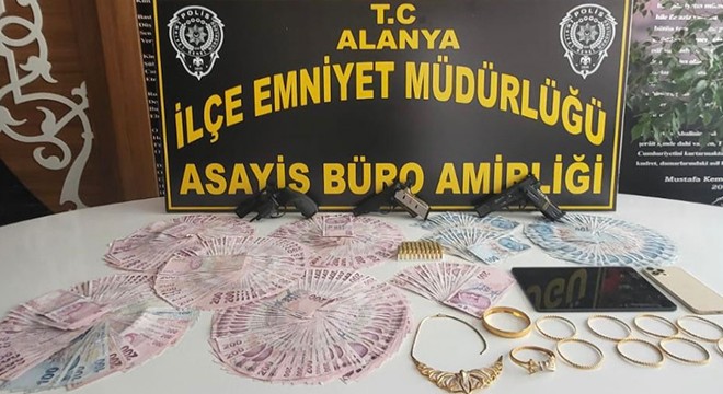 Alanya Cumhuriyet Başsavcılığı talimatları doğrultusunda, Alanya İlçe Emniyet Müdürlüğü ekiplerince, Sugözü Mahallesi'nde bulunan bir evde meydana gelen hırsızlık olayı ile ilgili çalışmalar başlatıldı. Hırsızlık olayını E.A.'nın gerçekleştirdiği tespit edildi. Ekipler E.A.'nın evinde ve aracında yapılan aramada ruhsatsız 3 tabanca ve bunlara ait fişekler, 10 bilezik ve çeşitli ziynet eşyaları, yüklü miktarda para ve çeşitli elektronik malzemeler ele geçirdi. Hırsızlık şüphelisi E.A. sevk edildiği adli makamlarca tutuklandı.