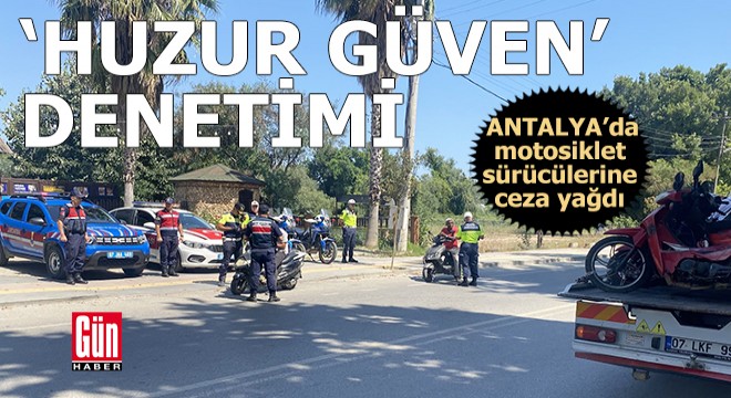 Antalya İl Jandarma Komutanluğı Trafik Şube Müdürlüğü ve Manavgat ilçe Jandarma Komutanlığı ekiplerce, 'huzur güven' trafik uygulaması gerçekleştirildi. Ekiplerce yapılan denetimlerde, kask kullanmayan 88, sürücü belgesi olmadığı halde araç kullanan 11, sigortasız ve muayenesiz araç kullanan 13, plakasız araç kullanan 8 ve abartı egzoz kullanan 6 olmak üzere toplam 126 motosiklet sürücüsüne 510 bin Türk Lirası ceza yazıldı. Denetimlerde, 13 motosiklet trafikten men edildi.