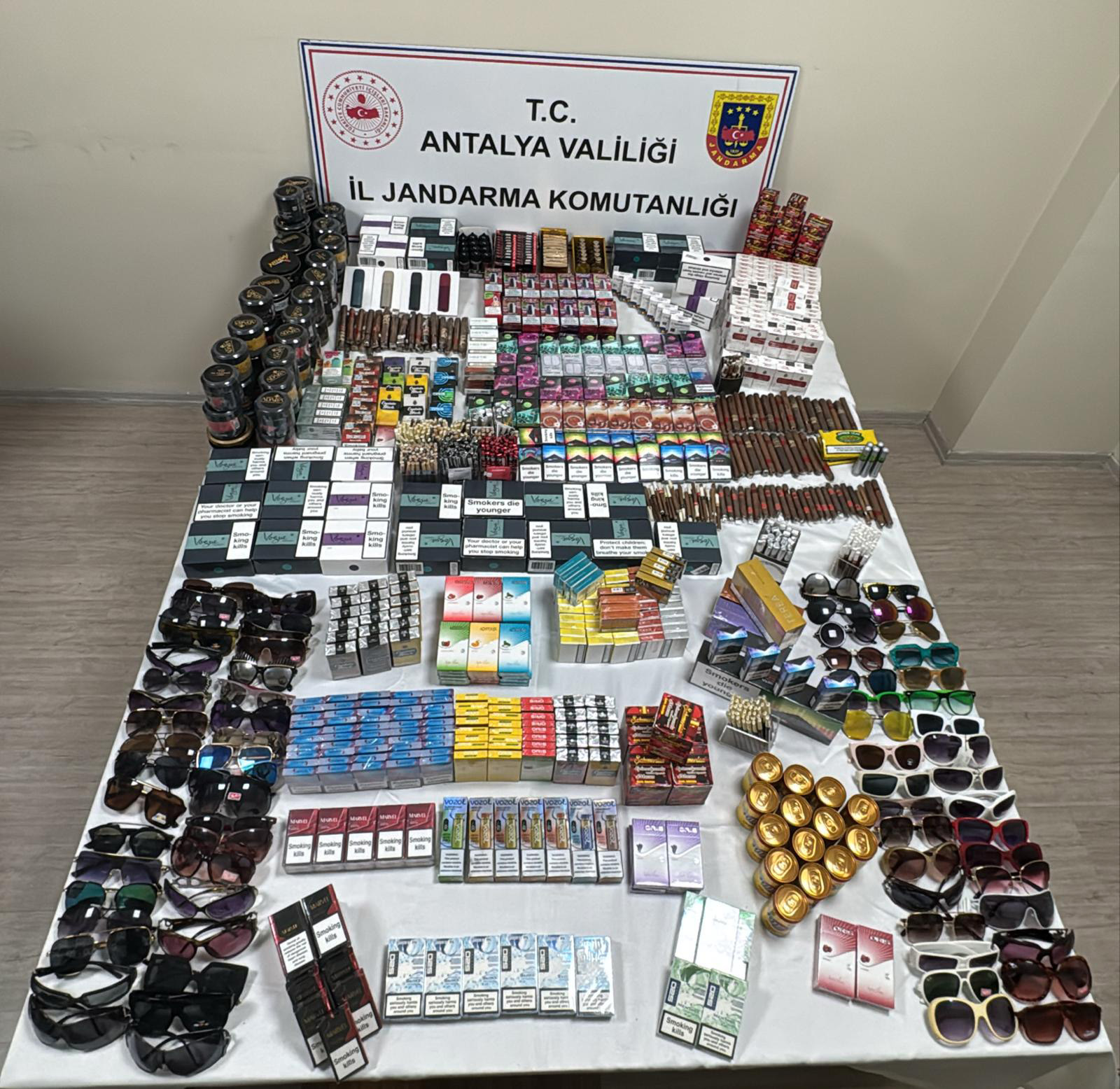 Kemer'e bağlı Göynük ve Çamyuva mahallelerinde bazı işletmelerde bandrolsüz sigara, elektronik sigara, kaçak tütün ve bandrolsüz puro bulunduğuna yönelik bilgi edinen Kemer İlçe Jandarma Komutanlığı'na bağlı ekipler, adli makamlardan alınan arama kararıyla S.Ö., V.B., A.Ç., V.Ö. ve A.A.'ya ait 5 iş yerine baskın düzenledi. Yapılan aramalarda piyasa değeri yaklaşık 1 milyon 250 bin lira olan 893 paket bandrolsüz çeşitli markalara ait kaçak sigara, çeşitli ebat ve markalara ait 587 kaçak puro, çeşitli markalarda 214 paket tütün, çeşitli markalarda 102 kaçak elektronik sigara cihazı ve aparatları, çeşitli markalarda 62 paket bandrolsüz nargile tütünü, 100 kaçak güneş gözlüğü, 250 gram bitkisel karışımlı 31 bandrolsüz macun, 45 gram bitkisel karışımlı 12 bandrolsüz macun ve 132 bandrolsüz cinsel istek arttırıcı içecek ele geçirildi. Olayla ilgili Kemer Cumhuriyet Savcısının talimatıyla 5 şüpheli hakkında adli işlemler başlatıldı.