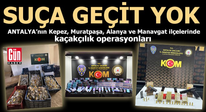 Antalya İl Emniyet Müdürlüğü Kaçakçılık ve Organize Suçlarla Mücadele Şube Müdürlüğü ekipleri, Antalya'da suç ve suçlularla mücadele kapsamında çalışmalar gerçekleştirdi. Bu kapsamda, son 1 haftada Kepez, Muratpaşa, Alanya ve Manavgat ilçelerinde gerçekleşen operasyonlarda, 21 bin 512 şişe ve 195 litre kaçak içki, 15 bin 380 adet boş/dolu makaron, 3 bin 241 paket kaçak sigara, 927 kaçak emtia, 715 kaçak elektronik sigara, 68 kilogram kaçak tütün ve 16 kaçak cep telefonu ele geçirildi. '6136 sayılı kanuna muhalefet etmek' suçundan yakalanan 4 şüpheliden 2'si tutuklanırken, 'tefecilik' suçundan yakalanan 1 şüpheli tutuklandı. '5607 sayılı kanuna muhalefet etmek' suçundan 18 şüpheliye adli işlem yapıldı. Bu kapsamda gerçekleştirilen aramalarda, 4 tabanca ve şarjör ile 238 tabanca fişeği ele geçirildi.