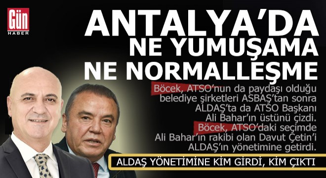 Antalya Büyükşehir Belediyesi'nin 1995 yılında kurulan ve yüzde 94,4 hissesi ASAT Genel Müdürlüğü, yüzde 1'er hissesi Antalya Büyükşehir Belediyesi, Muratpaşa Belediyesi, Kepez Belediyesi ve ATSO ile yüzde 0,6 hissesi Konyaaltı Belediyesi'nde olan ALDAŞ şirketinde yeni yönetim belirlendi. Antalya Büyükşehir Belediye Başkanı Muhittin Böcek başkanlığında oluşan yönetim kurulunda, önceki yıllarda ATSO başkanının yönetiminde görev aldığı ALDAŞ şirketinde, ATSO Başkanı değişmesine rağmen yönetim kurulunda ATSO'yu temsil eden isim değişmedi. ATSO Başkanıyken geçen dönemki yönetim kurulunda görev alan eski ATSO Başkanı Davut Çetin, ALDAŞ'ın yeni yönetiminde de yönetim kurulu üyesi olarak seçildi. ALDAŞ'ın yeni yönetim kurulunda da ilk defa ATSO'nun başkanına yer verilmedi.