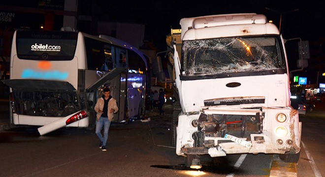 Kaza, dün saat 22.00 sıralarında Serik ilçesi Orta Mahalle Belek yolu otobüs terminali önünde meydana geldi. Henüz sürücüsü tespit edilemeyen 26 ND 010 plakalı yolcu otobüs, kavşaktan dönüp terminale girmek istediği sırada karşı yönden gelen ve sürücüsü tespit edilemeyen 07 FCT 78 plakalı hafriyat kamyonuyla çarpıştı. Kazada otobüste bulunan 4 yolcu hafif yaralandı.