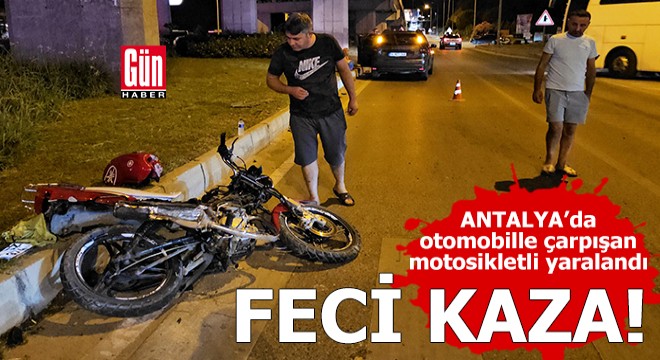 Kaza, dün saat 23.00 sıralarında D-400 Karayolu Çakalderesi Mevkisi'nde meydana geldi. Side'den Manavgat istikametinde ilerleyen Ali Orhan Ç.'nin kullandığı 07 SZ 974 plakalı motosikletle, Ali A. idaresindeki 34 HZT 346 plakalı otomobil çarpıştı. Kazada yaralanan motosiklet sürücüsü Ali Orhan Ç., ihbar üzerine olay yerine gelen sağlık ekiplerince hastaneye götürüldü. Kazayla ilgili inceleme başlatıldı.
