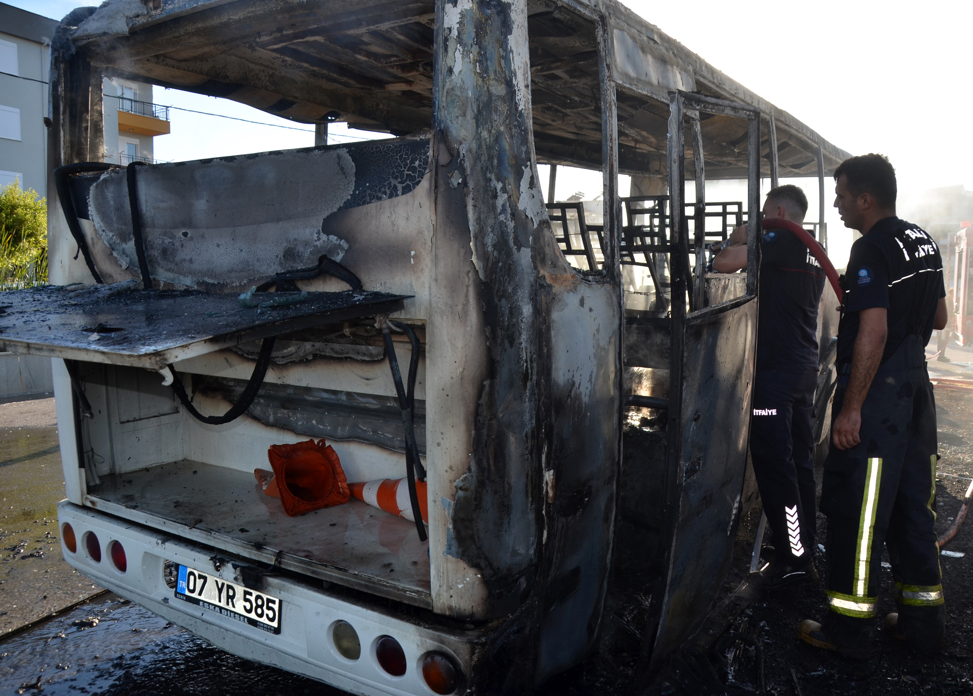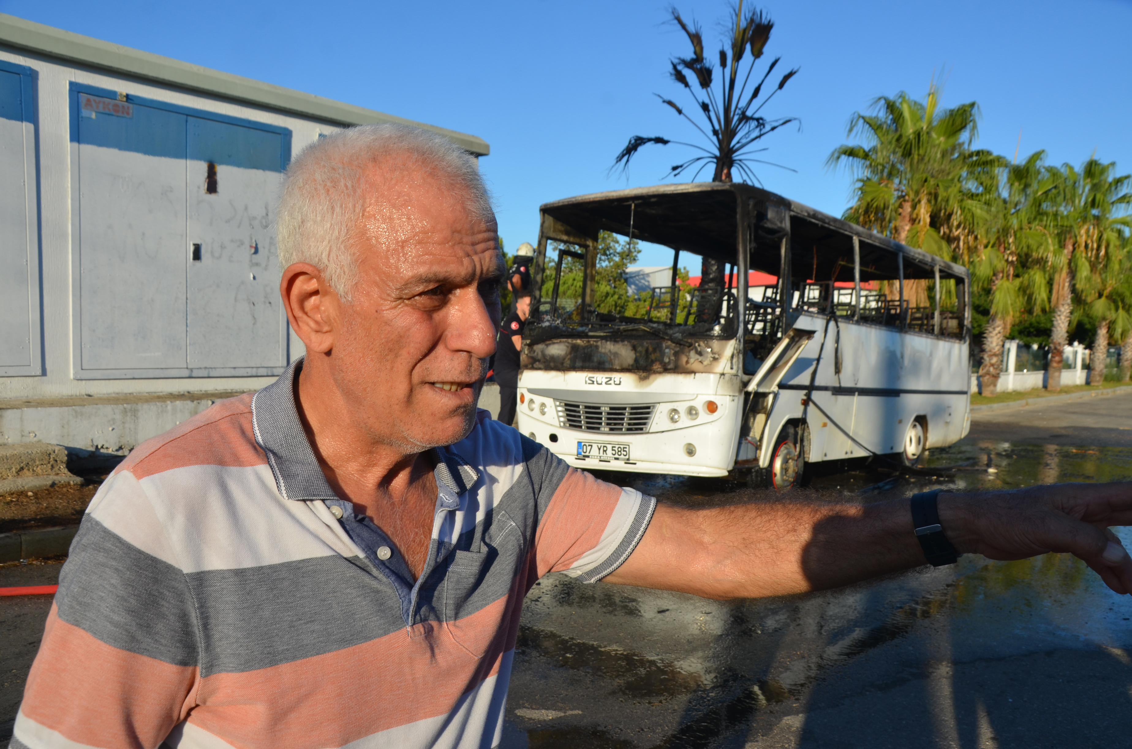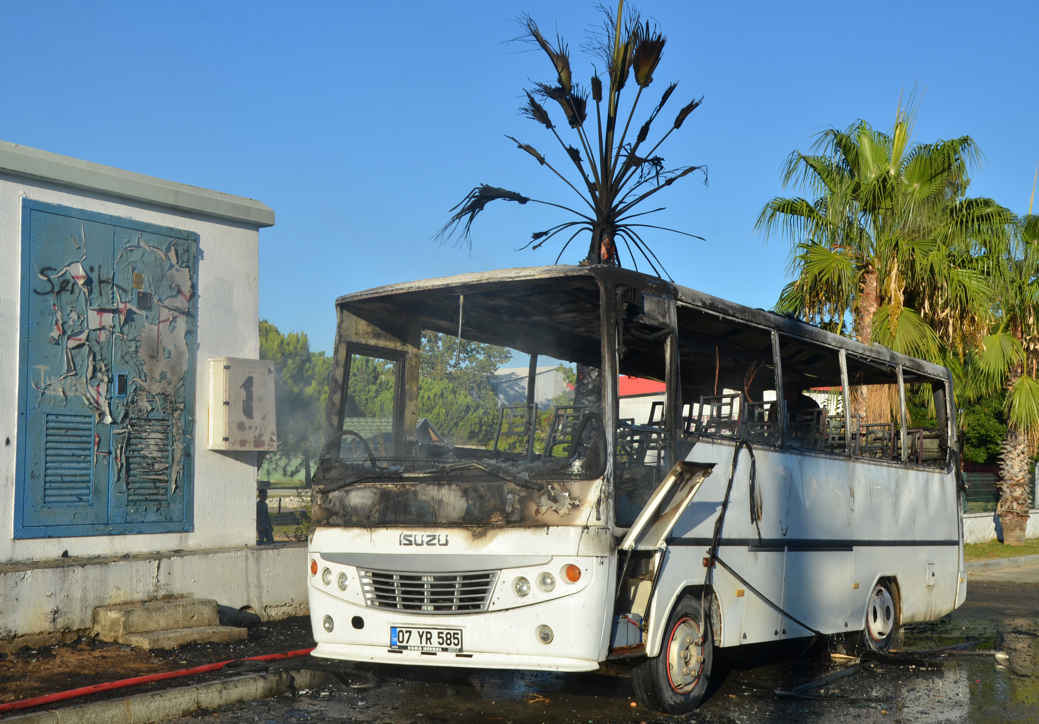 Serik'e bağlı Akçaalan Mahallesi'nde dün saat 17.00 sıralarında park halindeki Muharrem Uysal'a ait 07 YR 585 plakalı otobüs henüz bilinmeyen nedenle yanmaya başladı. Durumu fark edenlerin 112 Acil Çağrı Merkezi'ne bildirmesi üzerine olay yerine gelen itfaiye ekipleri yangına müdahale etti. İtfaiyenin çalışmasının ardından yangın söndürülürken araç kullanılamaz hale geldi. Yangının sıçradığı palmiye ağacı ise zarar gördü. Mahalle sakinleri yanan aracı ve itfaiye ekiplerinin müdahalesini endişeyle izledi.