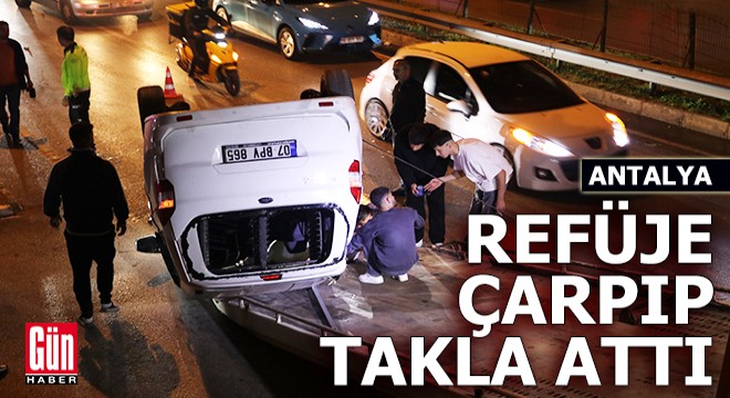 Kaza, dün saat 22.00 sıralarında Muratpaşa ilçesine bağlı Zerdalilik Mahallesi Burhanettin Onat Caddesi üzerinde meydana geldi. Sürücü Eyüp S., 07 BPV 865 plakalı hafif ticari otomobille Mevlana Caddesi'ne seyir halindeyken direksiyon hakimiyetini kaybetti. Refüje çıkan araç, ardından Ramazan D. idaresindeki 07 MC 8061 plakalı otomobile çarparak takla attı. Kaza sonrası bölgeye ekipler sevk edildi. Takla atan araçtan kendi çabasıyla çıkan Eyüp S.'nin sağlık durumunun iyi olduğu öğrenildi. Kazanın ardından hurdaya dönen hafif ticari araç ise yol üzerinden çekildi.