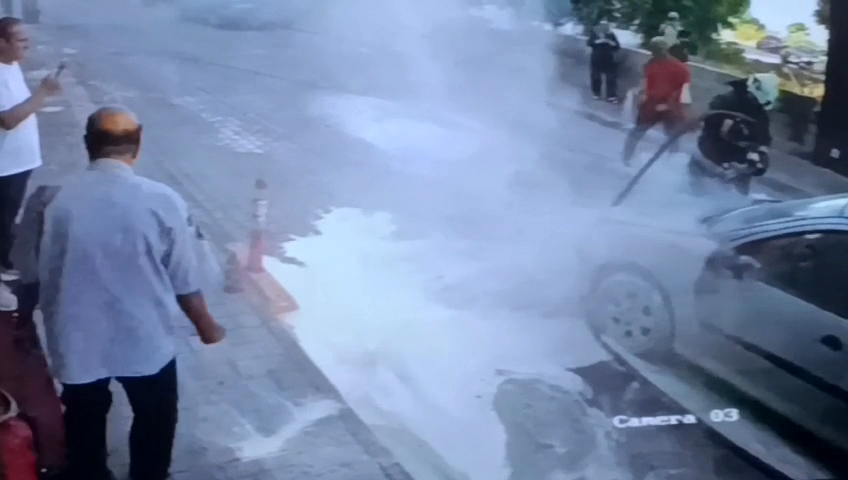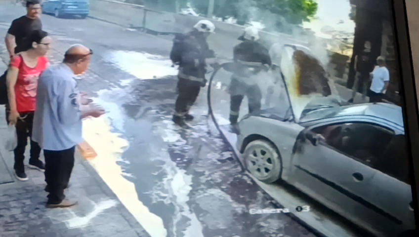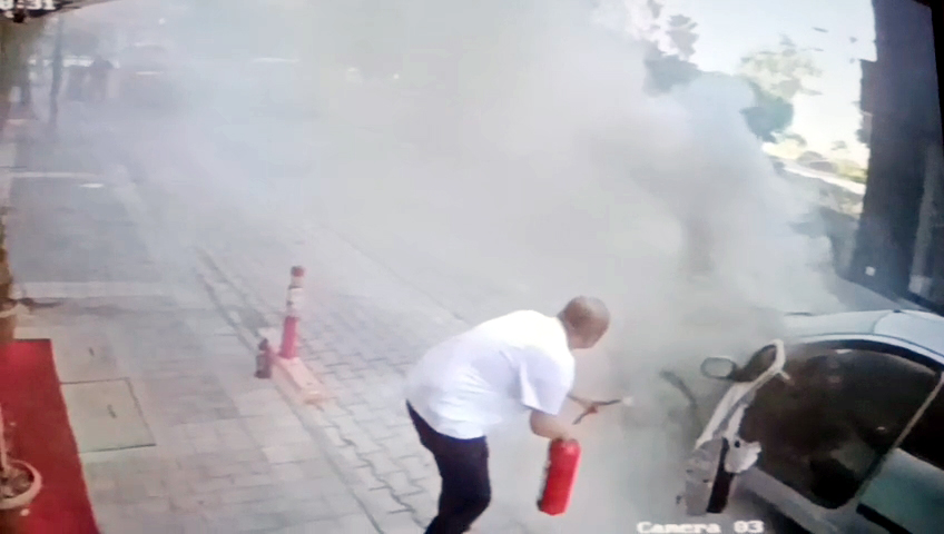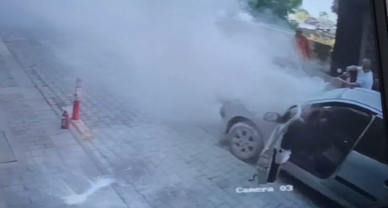 Manavgat'a bağlı Yukarı Hisar Mahallesi'nde Veli İspirlioğlu'nun kullandığı 07 LHV 26 plakalı otomobil, seyir halindeyken alt tarafından yanmaya başladı. Kısa sürede büyüyen alevleri fark eden sürücü otomobili durdurdu. Alevlere ilk müdahaleyi çevredekiler yangın tüpleriyle yaptı. İhbar üzerine olay yerine itfaiye ekipleri de sevk edildi. Kısa sürede gelen Antalya Büyükşehir Belediyesi Manavgat İtfaiye Birimi'ne bağlı ekipler alevlere müdahale ederek, söndürdü. Yangın sonrası araçta hasar oluştu. Araçta başlayan yangın ve müdahale çabaları bir iş yerinin güvenlik kamerasına yansıdı.