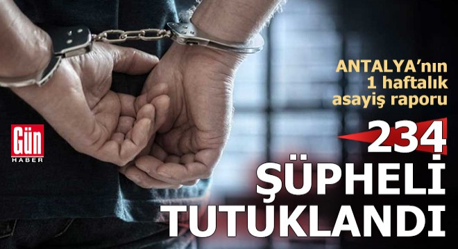 Antalya Emniyet Müdürlüğü birimleri, son 1 haftada 'kasten yaralama, kasten öldürme, cinsel suçlar ve hırsızlık' suçları başta olmak üzere, meydana gelen asayiş olaylarına yönelik uygulamalar ve denetimler gerçekleştirdi. Denetimlerde, 273 bin 725 kişi hakkında sorgulama yapıldı. Şüphelilerin, 536'sı aranan olmak üzere yakalanan toplam 1825 şüpheliden 234'ü tutuklandı.