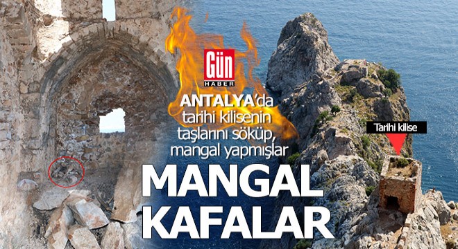 Denizden yaklaşık 35 metre yüksekte sarp kayalığa konumlu tarihi kilisenin içerisine girenlerin taşları söküp, ateş alanı hazırladığı ve mangal yapıp duvarlara zarar verdiği görüldü.