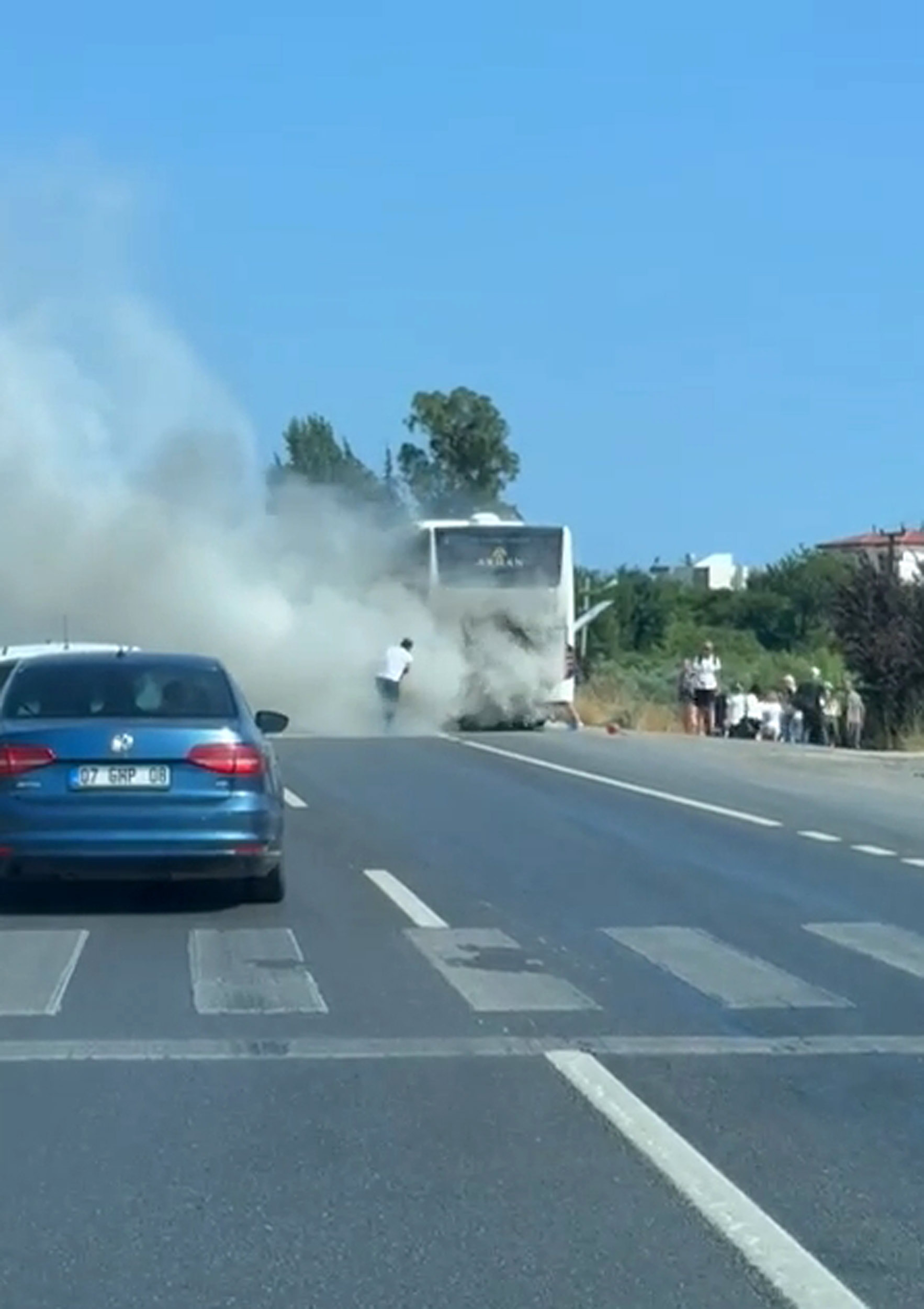 Antalya Havalimanı'ndan aldığı Polonyalı 43 turisti Alanya'daki otellerine götürmek üzere yola çıkan Yunus Bişirik'in kullandığı 07 GFU 03 plakalı tur otobüsü, D400 kara yolunun Manavgat yakınlarında motor bölümünden alev alarak yanmaya başladı. Yangını fark eden şoför, otobüsü yol kenarına park ederek, yangın tüpüyle müdahale etti. Bu sırada aralarında çocukların da bulunduğu otobüsteki turistler tahliye edildi. Haber verilmesi üzerine olay yerine gelen itfaiye ekipleri yangına müdahale ederek söndürdü ve soğutma çalışması yaptı. Otobüste çıkan yangın sonrasında Polonyalı turistler, olay yerine çağrılan otobüslerle konaklayacakları otellere götürüldü.