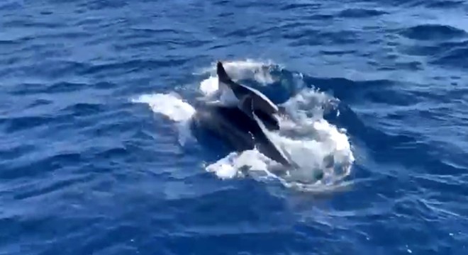 Alanya Kalesi açıklarında tekneyle gezintiye çıkan turistler yunuslarla karşılaştı. 3 yunus teknenin seyrine bir süre eşlik etti. Tatilciler bu anları ilgiyle izledi. Yolculukta yunusları izleyen turistler, cep telefonuyla eğlenceli anları kaydetti.