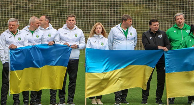 Antrenman aletleriyle saha ortasına İngilizce 'Savaşa Hayır' yazan oyuncular "Yaşasın Ukrayna, kahramanlarımız yaşasın" sloganı attı.