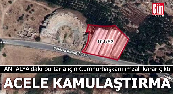"Limyra Antik Kenti Ziyaretçi Karşılama Merkezi ve Çevre Düzenleme Projesi kapsamında arkeolojik kazı ve restorasyon çalışmalarının gerçekleştirilebilmesi amacıyla Antalya İli, Finike İlçesi, Saklısu Mahallesinde bulunan özel mülkiyete ait 101 ada, 52 parsel numaralı taşınmazın, Kültür ve Turizm Bakanlığı tarafından acele kamulaştırılmasına, 2942 sayılı Kamulaştırma Kanunu'nun 27'nci maddesi gereğince karar verilmiştir."