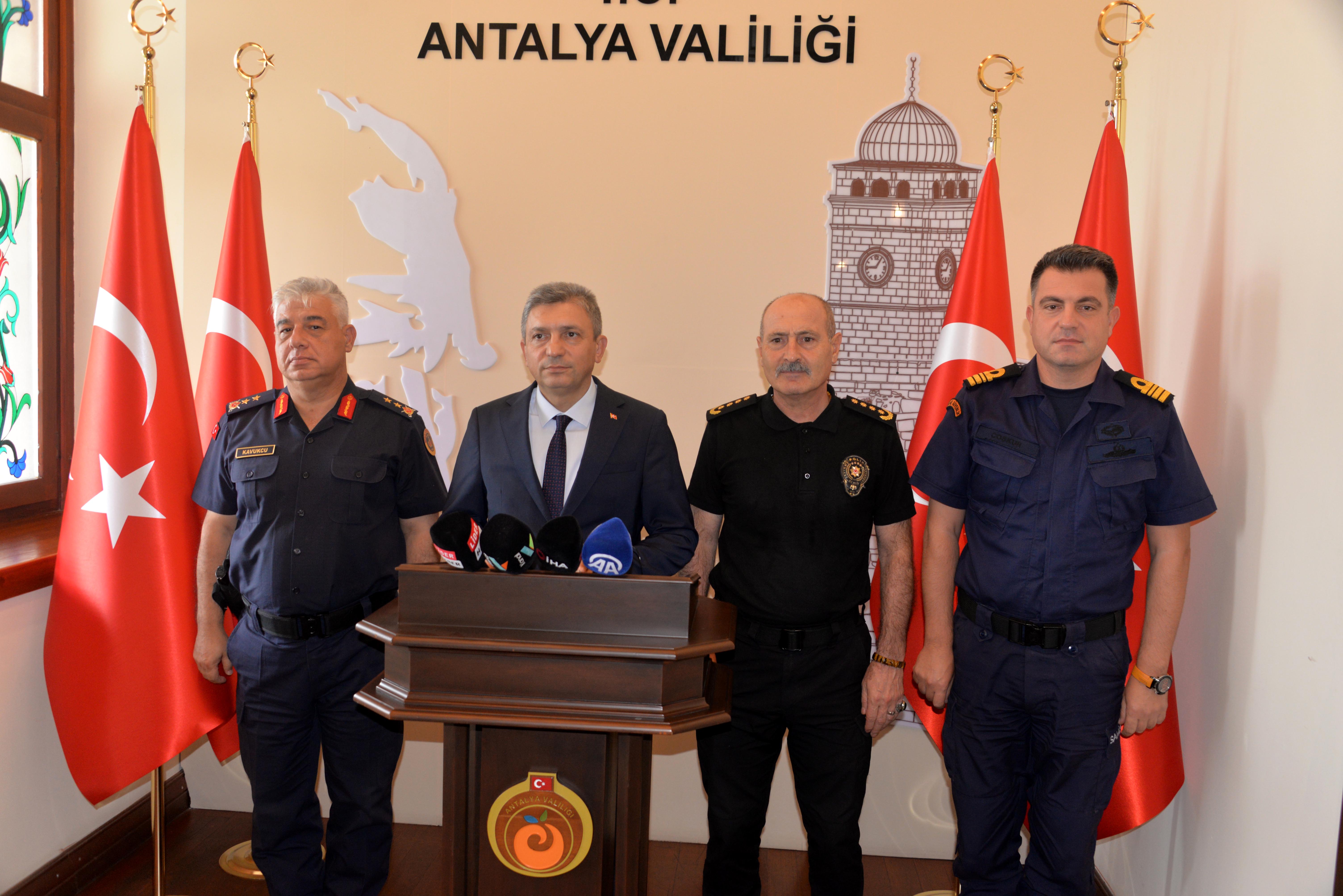 İçişleri Bakanlığı'nın Türkiye'nin Huzuru Projesi kapsamında düzenlenen Antalya'nın Huzuru Güvenlik ve Asayiş Bilgilendirme Toplantısı, Antalya Valiliği Hükümet Konağında gerçekleştirildi. Vali Hulusi Şahin, eylül ayı içerisinde güncel güvenlik ve asayiş olaylarına ilişkin basına açıklamalarda bulundu. Basın Bilgilendirme Toplantısı'nda, Vali Şahin'e, İl Jandarma Komutanı Tümgeneral Ahmet Kavukcu, İl Emniyet Müdürü Sabit Akın Zaimoğlu ve Sahil Güvenlik Grup Komutanı Yarbay Tolga Coşkun eşlik etti.