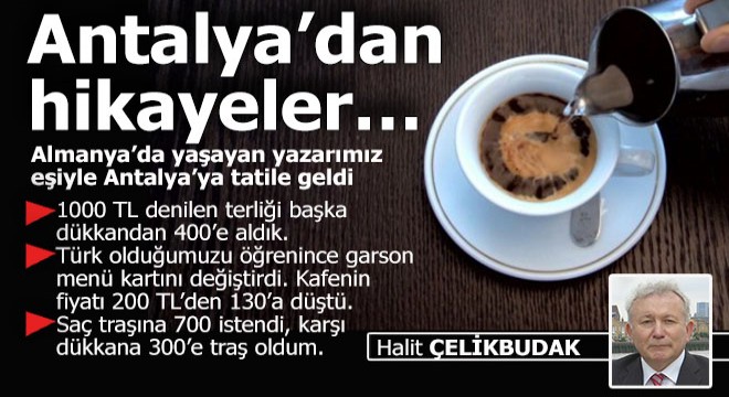 Eşime de ne içeceğini sordum. Garson şaşırdı. Bana ‘Aaa siz Türkçe konuşuyorsunuz. Türksünüz‘ dedi ve fiyat listesini elimden alıp seyirtip gitti. Bir başkasını getirdi. ‚Size yanlışı vermişim. Türkler için bu geçerli‘ dedi… Baktım aynı liste fiyatlar değişik. Biraz önceki kahvenin karşısında 130 Lira yazıyor.