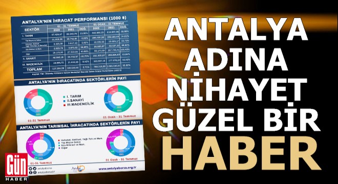 Temmuzda bir önceki yılın aynı ayına göre toplam ihracat Türkiye’de yüzde 47 artarken, Antalya’da ise yüzde 30,3 arttı. Aynı dönemde toplam tarım ve gıda ihracatı Türkiye’de yüzde 4,1 artış gösterirken, Antalya’da yüzde 13,6 arttı. Yaş meyve sebze ihracatı Türkiye’de yüzde 10,3, Antalya’da ise yüzde 3,7 azaldı. Aynı dönemde süs bitkileri ve mamulleri ihracatı Türkiye’de yüzde 98,2 artış gösterirken, Antalya’da yüzde 36 arttı. Sanayi ihracatı Türkiye’de yüzde 10,6 artarken, Antalya’da yüzde 15,8 azaldı. Maden ihracatı Türkiye’de yüzde 28,3, Antalya’da ise 8,4 arttı.