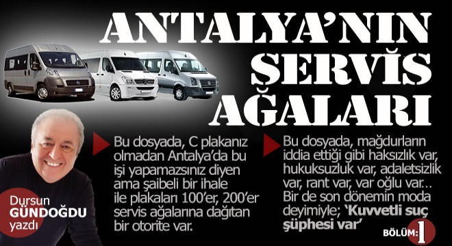 Bu dosyada, onlara, C plakanız olmadan Antalya’da bu işi yapamazsınız diyen ama şaibeli bir ihale ile plakaları 100’er, 200’er servis ağalarına dağıtan bir otorite var.