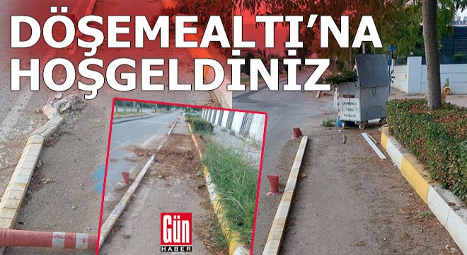 Bu fotoğraf ise ya çevredeki bir inşaatın, ya belediyenin veya doğalgazcıların bir eserini gösteriyor… Çürüyen otlar, toz toprak, bisiklet yolunu ölüm yoluna çevirmiş. Bu Döşemaltı'nın en büyük caddelerinden biri... Sokaklar ise daha berbat... Özellikle doğalgaz sonrası delik deşik edilen yollar, değişik renkte ve gelişi güzel döşenen parke taşları yüzünden görsel kirlilik yarışmalarında birinciliği kimseye kaptırmayacak cinsten... Kısaca Döşemealtı ilçe olduğundan bu yana en mezbelelik dönemini yaşıyor.