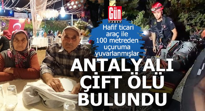 Manavgat'ın Gebece Mahallesi’nde Ramazan ve Emine Acar'dan dün öğle saatlerinden itibaren haber alamayan yakınları, yetkililerden yardım isteyip, bir yandan mahalleli ile aramaya başladı. Mahalleli, Ramazan Acar'ın kullandığı 07 BAS 868 plakalı hafif ticari aracın, Gebece- Mahrumçalı yolu üzerinde 100 metrelik uçurumdan yuvarlandığını fark etti. Haber verilmesi üzerine kaza yerine Manavgat İlçe Jandarma Komutanlığı, Antalya Büyükşehir Belediyesi itfaiyesi ve sağlık ekipleri sevk edildi. Aracın düştüğü yerin sarp kayalık olması nedeniyle itfaiye ekipleri halatlarla güçlükle uçurumdan indi. Ekipler, Acar çiftinin yaşamını yitirdiğini tespit etti. Cenazeler sedyeyle yine halatla çıkarılabildi.