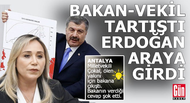 “Antalya Milletvekili Tuba Vural Çokal ile Sağlık Bakanı Fahrettin Koca tartıştı. Çokal, Manavgat’ta özel hastanede vefat eden bir yakınını anlatarak, bakanlığın yeterli denetim yapmadığını söyledi. Sağlık Müdürüne ulaşamadığını anlatan Çolak’ın sözlerini kesen Bakan Koca, “O sağlık müdürü sizin talebinizle atandı. Sorumluluğu bize atamazsınız. Özel hastanelerle ilgili teftiş başlatmıştık, onu da siz durdurdunuz” dedi. Cumhurbaşkanı Erdoğan araya girerek, “Ölen arkadaşımız bizim ilçe başkanımız. Sağlığın özeli devleti olmaz. Hastane ayrımı olmadan gerekli denetimlerin yapılması lazım. İhmal var mı bakın” diyerek tartışmayı sonlandırdı. Söz alan bazı milletvekilleri de sağlık sisteminde ciddi sorunlar olduğunu aktardı.”