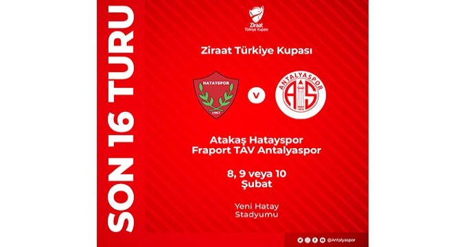 Süper Lig'de son haftalarda istediği sonuçları alamayan Fraport TAV Antalyaspor'un, Ziraat Türkiye Kupası son 16 turundaki rakibi belli oldu. Kırmızı beyazlı ekip, bir diğer Akdeniz temsilcisi Atakaş Hatayspor ile deplasmanda karşılaşacak. Antalyaspor, rakibini yenmesi halinde çeyrek finale yükselme başarısı gösterecek. İki ekip arasında ligde oynanan mücadeleyi Hatayspor 3-1 kazandı.