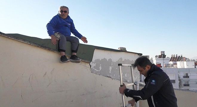 Gazetecileri karşısında görünce gülen Çalıcı, "Uyduda parazit vardı, onu düzeltmek için çatıdaki paletle yukarı çıktım ama inemedim. Arkamı dönüyorum düşecek gibi oluyorum. Yukarıdan daha yüksek görünüyor, düşecek gibi oluyordum. En iyisi 112'yi arayayım ve onları çağırayım dedim. Buranın yüksekliği 2- 2,5 metre var. Buradan değil ama yukarıdan gözüne yüksek görünüyor. Atlasam bacağım kırılır diye düşündüm. Hanımın haberi yok. Hatunu ve 112'yi aradım. Halat olsa inerdim ama bir daha tek çıkmam. İtfaiyemizden Allah razı olsun, geldiler ve bana yardım ettiler" dedi.